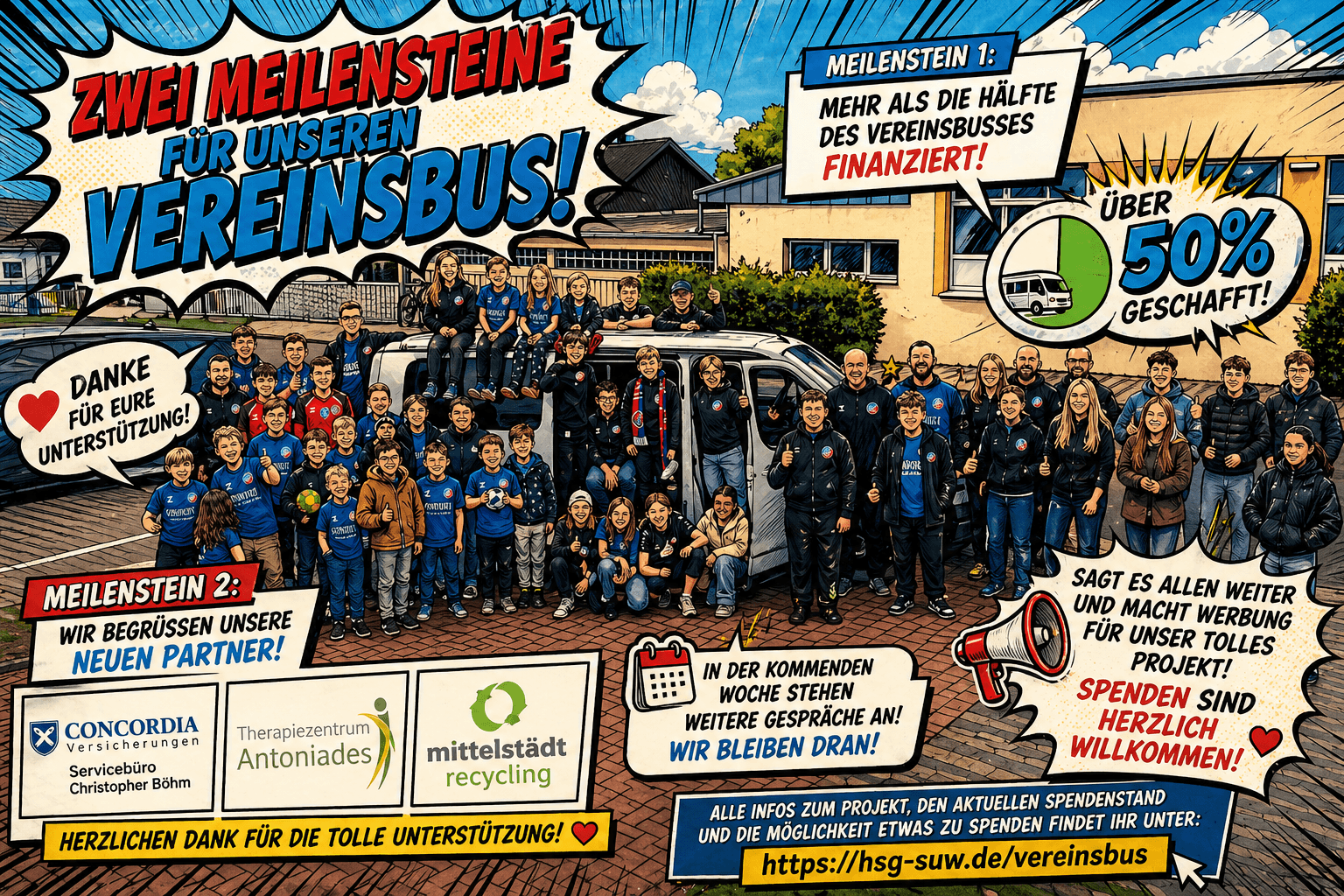 Ganz herzlich begrüßen möchten wir außerdem unsere neuen Partner: das Versicherungsbüro der Concordia mit dem Servicebüro Christopher Böhm, das Therapiezentrum Antoniades sowie Mittelstädt Recycling. Wir freuen uns sehr, diese Unternehmen an unserer Seite zu wissen, und bedanken uns ausdrücklich für die wertvolle Unterstützung unseres Busprojekts.